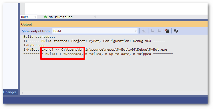 6. Observe the build output, so long as the build output ends with "1 succeeded" then the process has worked. You may now run your bot!