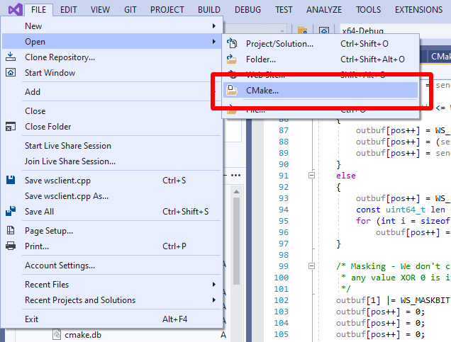 3. From within Visual Studio 2019, click the "File" menu, choose "Open" then "CMake", and select the CMakeLists.txt within the project folder