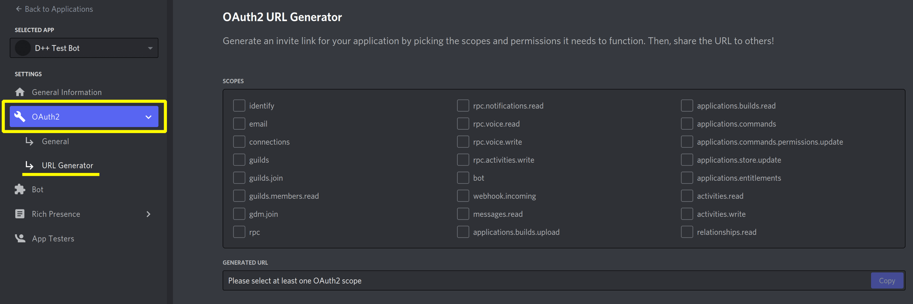 - Go to the "OAuth2" tab and click on the subpage "URL Generator".